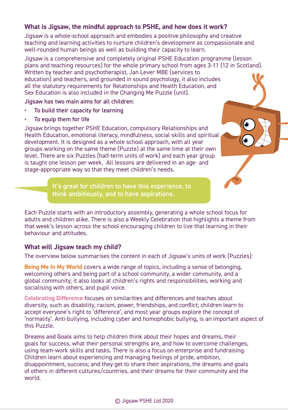 Personal, Social and Health Education (PSHE) is taught throughout Mayflower and to all pupils. Further information, as a Parent Guide, can be found below. One of the tools that our school uses to guide our planning and delivery of lessons is a scheme called Jigsaw. All documents below are Jigsaw's, but give a comprehensive insight into how their scheme and PSHE is organised.